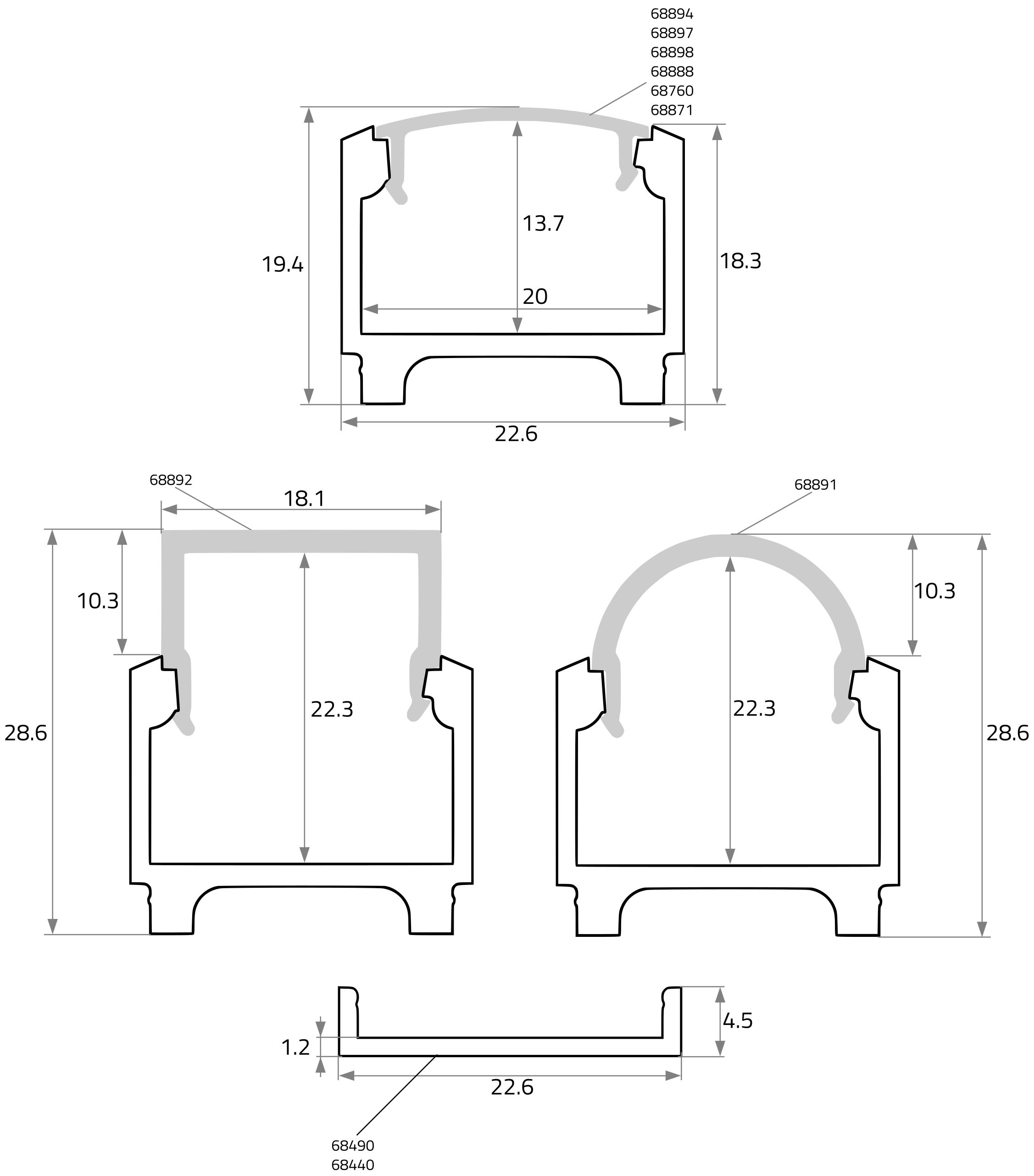 - Standard Aluminium profile, wide selection of covers and mounting clamps