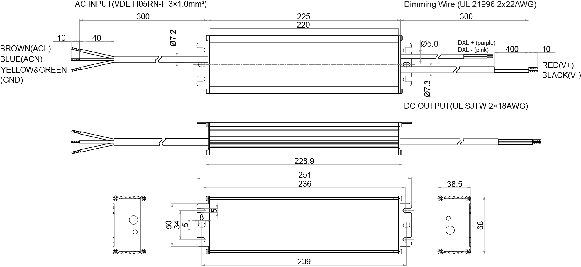 - LxWxH in mm: 251 x 68 x 38.5