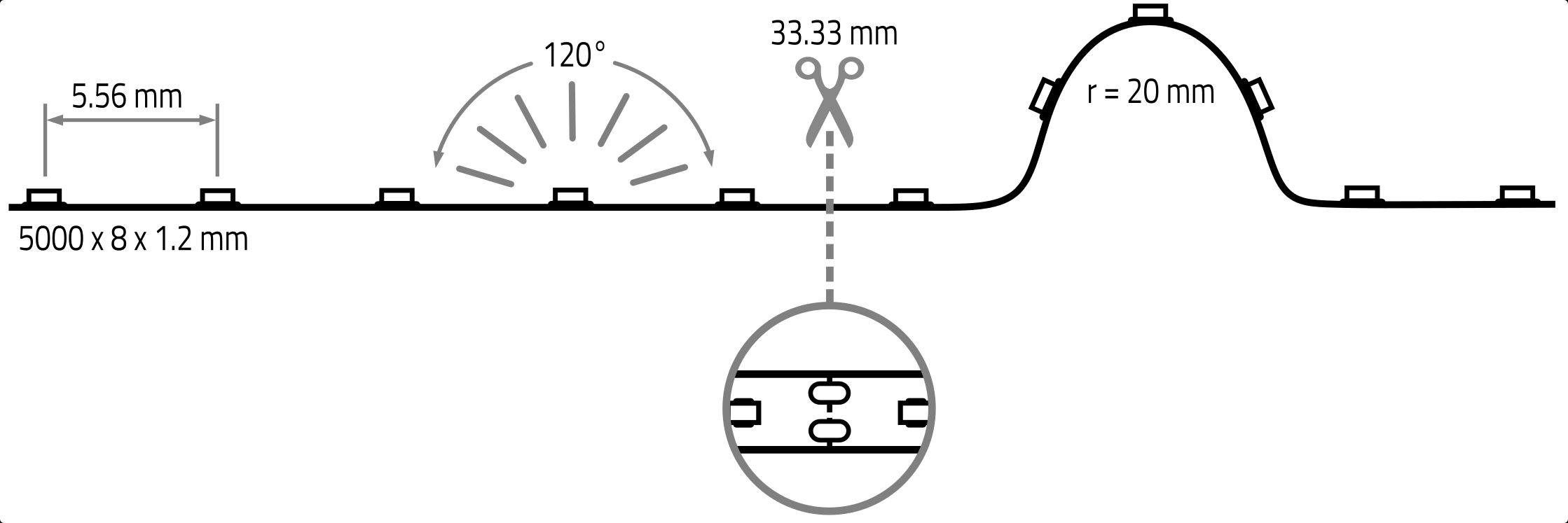- can be seperated every 3.33 cm or 6 LEDs