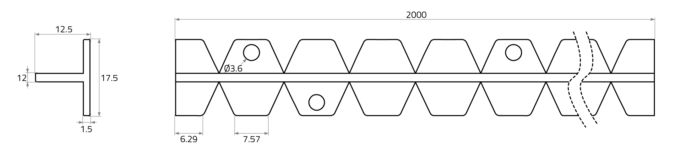 - LxWxH in mm: 2,000 x 17.5 x 12.5