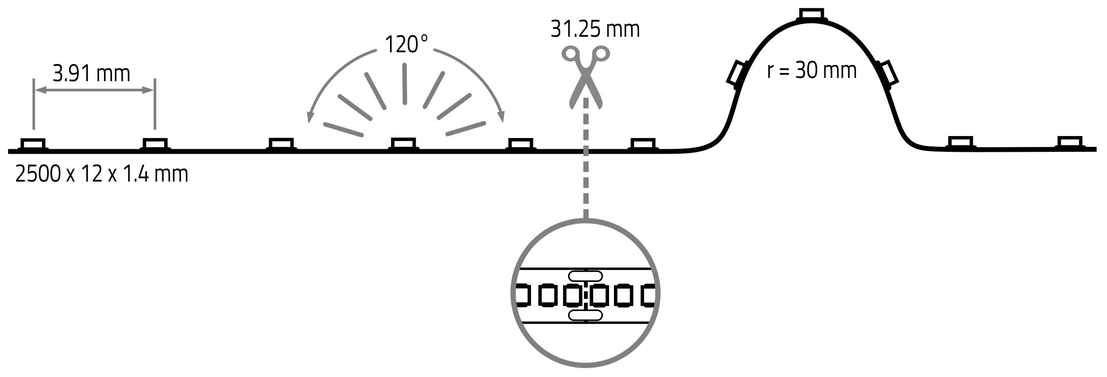 - can be seperated every 31.25 mm or 8 LEDs