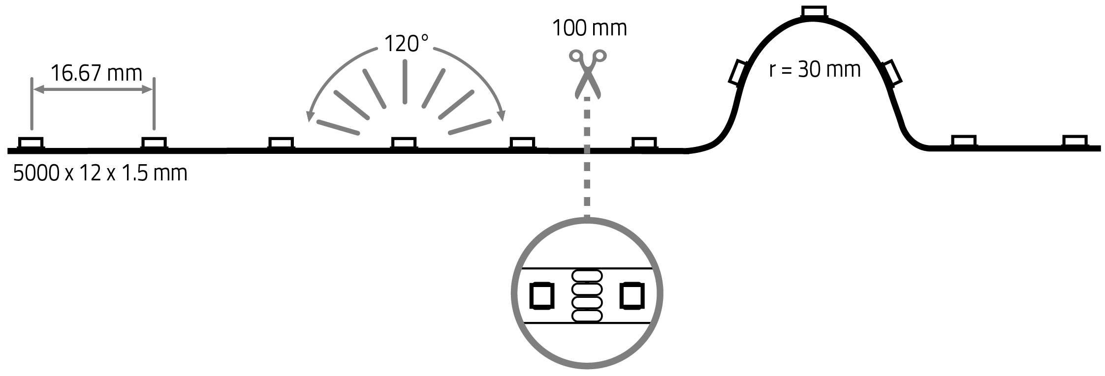 - can be seperated every 100 mm or 6 LEDs